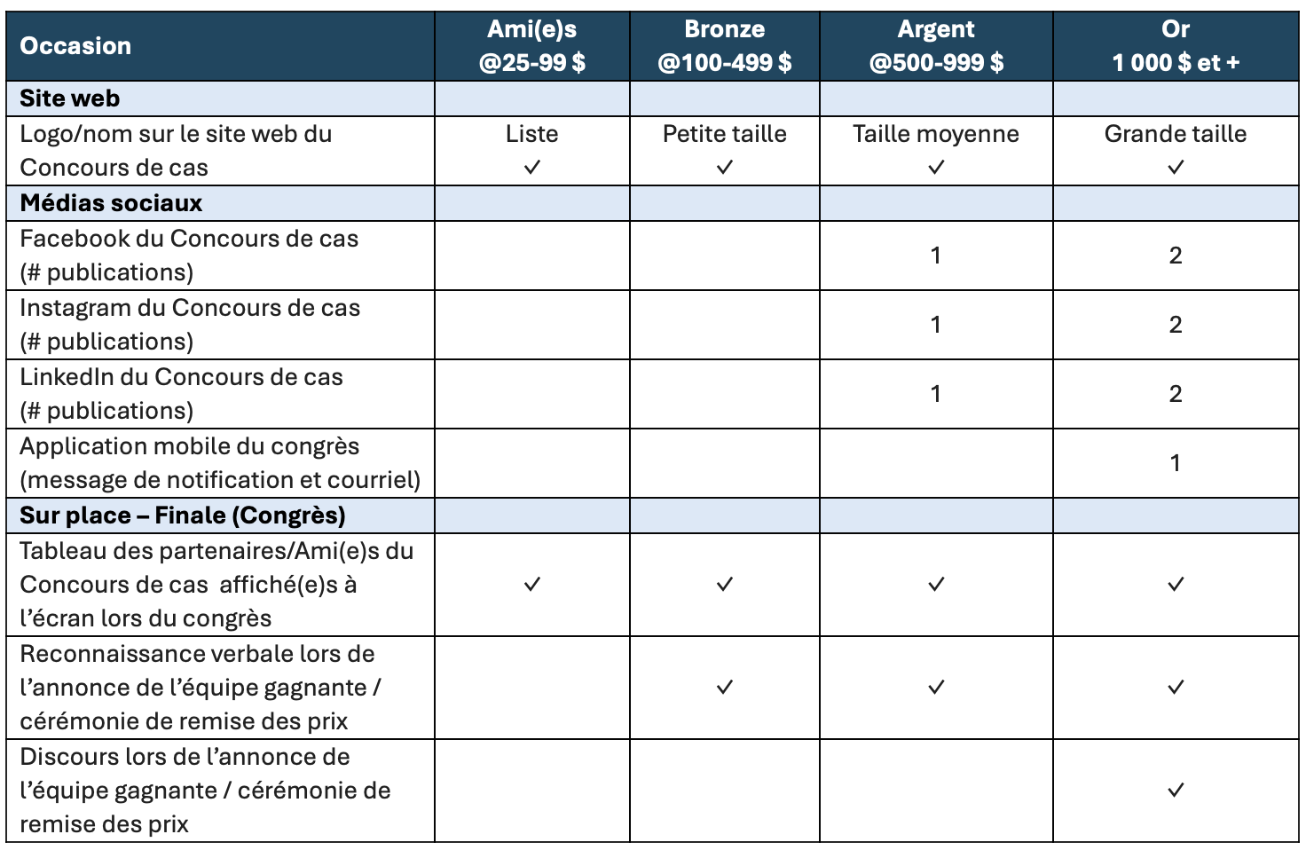 Faites un don: Voici la structure de soutien. Nous offrons quatre niveaux de partenariats et d’amitié. Les niveaux de forfaits disponibles sont décrits ci-après.